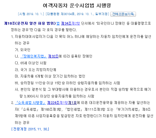 여객자동차 운수사업법 시행령 제18조(운전자 알선 허용 범위) 법 제34조제2항 단서에서 "외국인이나 장애인 등 대통령령으로 정하는 경우"란 다음 각 호의 경우를 말한다.
