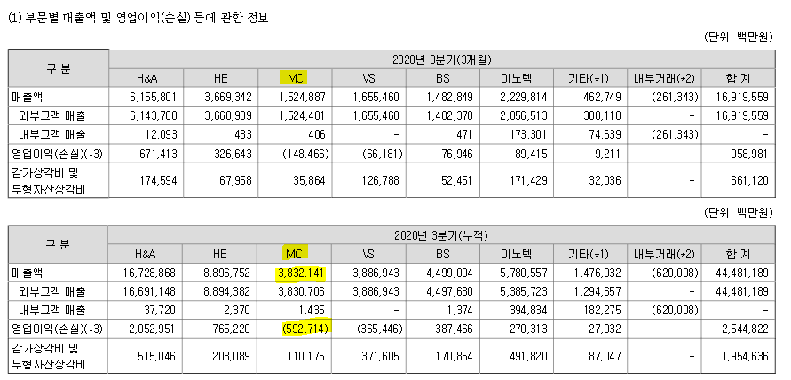 - 3개월, 누적 실적 모두 MC 부문에서 가장 큰 적자를 기록하고 있습니다.
